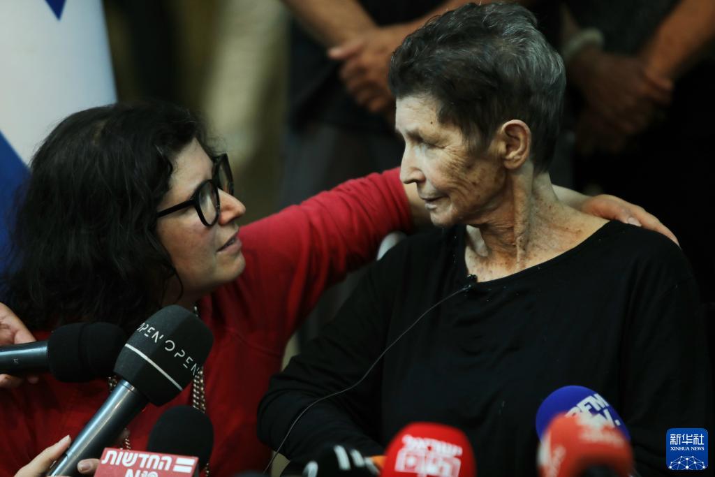 10月24日,獲釋的以色列被扣押人員約赫韋德· 利夫希茨(右)在以色列特拉維夫接受采訪。