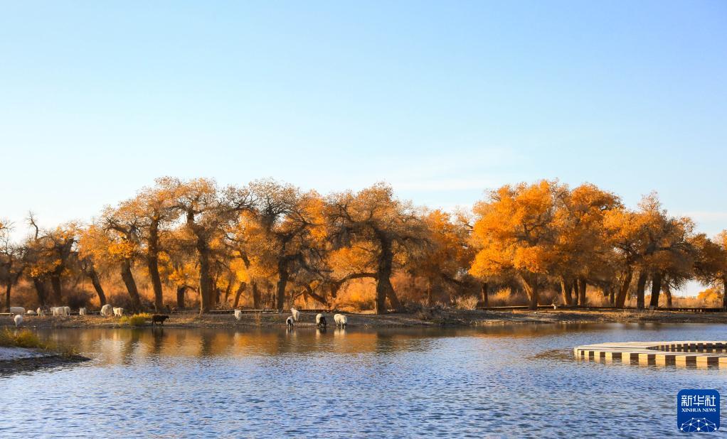 10月24日,羊群在胡楊林前飲水。