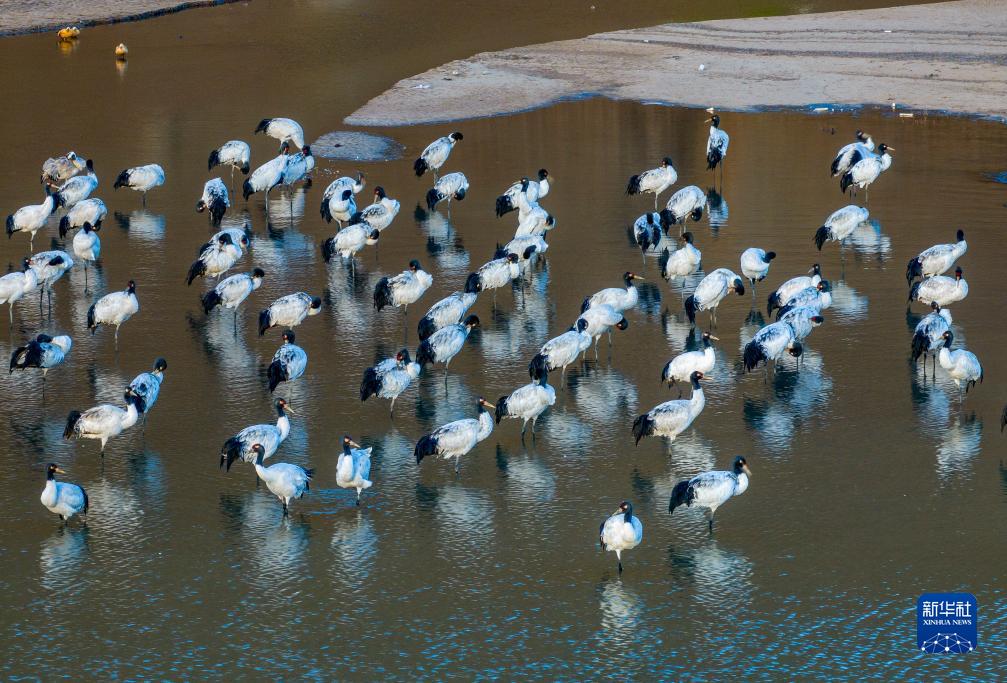 這是在拉薩市林周縣虎頭山水庫拍攝的越冬黑頸鶴(10月24日攝,無人機照片)。