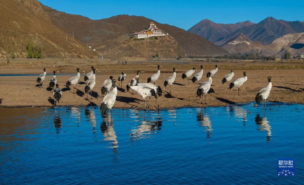 這是在拉薩市林周縣虎頭山水庫拍攝的越冬黑頸鶴(10月24日攝,無人機照片)。