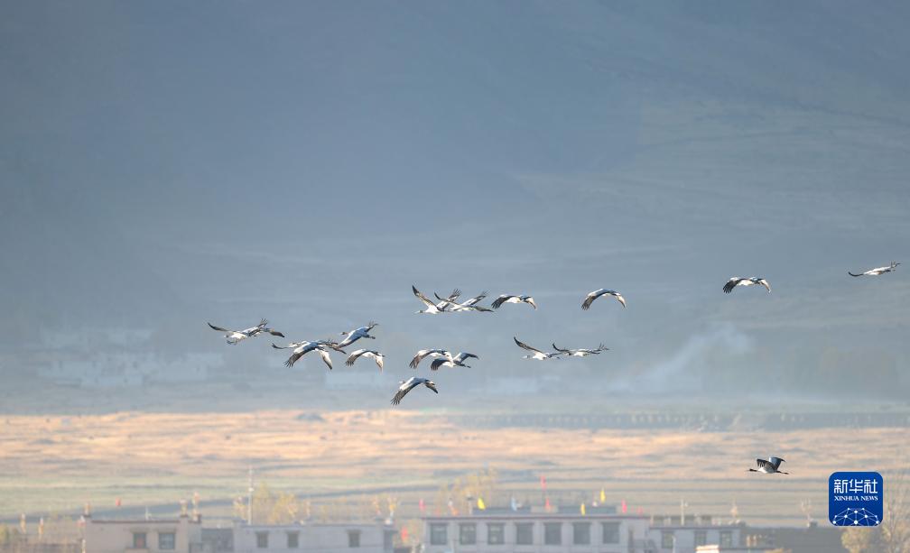 10月下旬,西藏自治區拉薩市林周縣迎來2023年第一批越冬黑頸鶴。它們將在這里一直待到來年三四月份。黑頸鶴是國家一級保護動物,主要棲息在海拔2500米至5000米的高原、草甸、沼澤地帶。拉薩北部的林周縣平均海拔約4200米,是黑頸鶴的主要越冬地之一。
