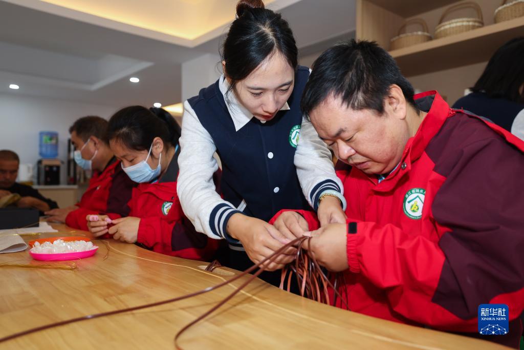 10月25日,黨員志愿者在杭州市臨安區玲瓏街道玲溪社區黨群服務中心共富工坊指導工人加工手工藝品。該工坊提供輕強度手工的輔助性就業崗位,目前已有46名殘疾人在這里實現家門口就業。