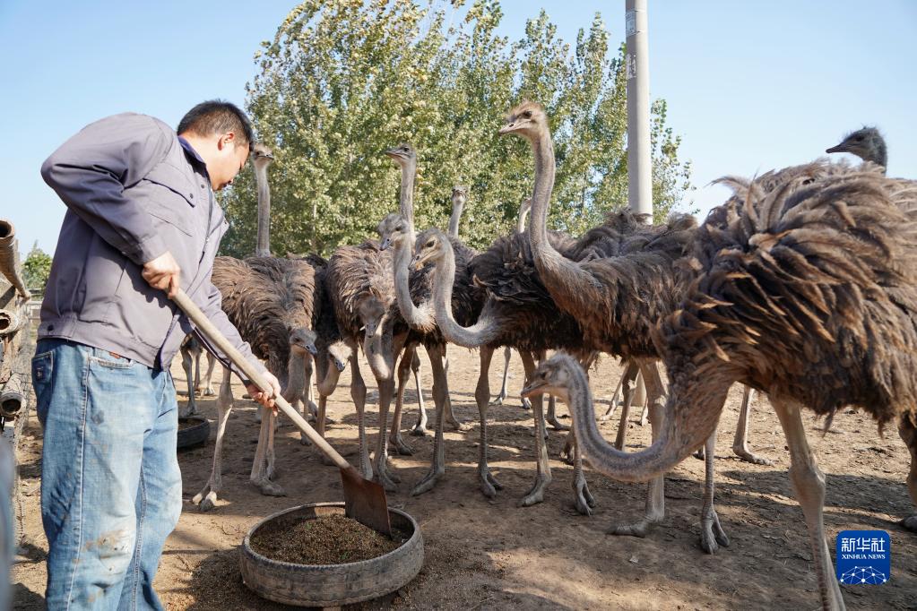 10月25日,辛集市小辛莊鄉小辛莊村辛南鴕鳥養殖園的工人在給鴕鳥喂食。