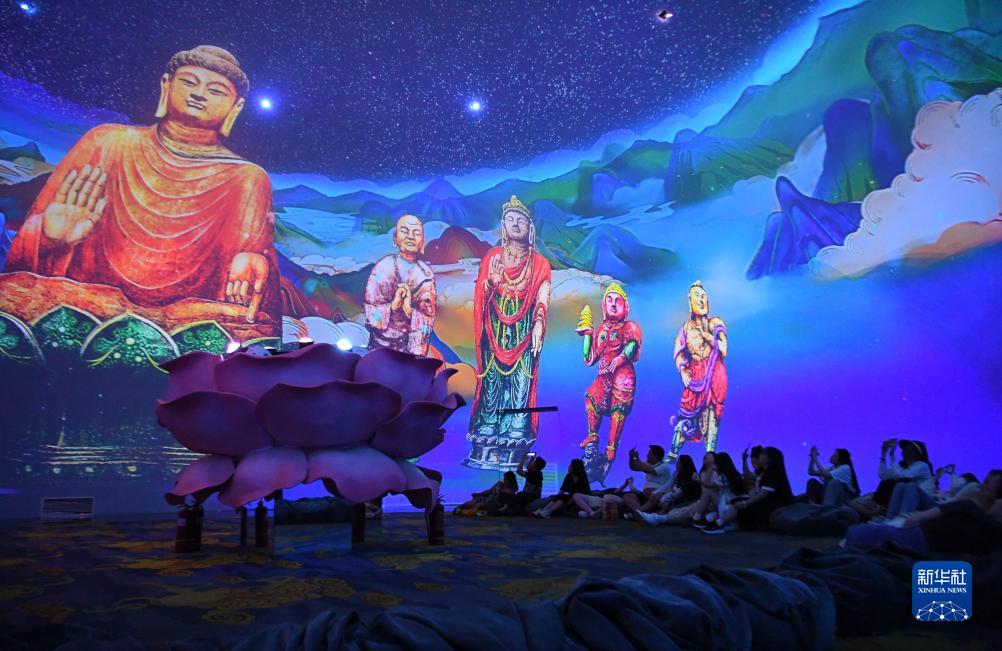 游客在河南洛陽無上龍門沉浸式體驗館觀看影片(2023年6月6日攝)。洛陽大遺址保護和遺址公園建設亮點突出,一批集空間游玩、非遺體驗、沉浸互動等為一體的文化場景次第涌現,優秀文創項目和產品破“圈”而出,讓年輕人心向往之。