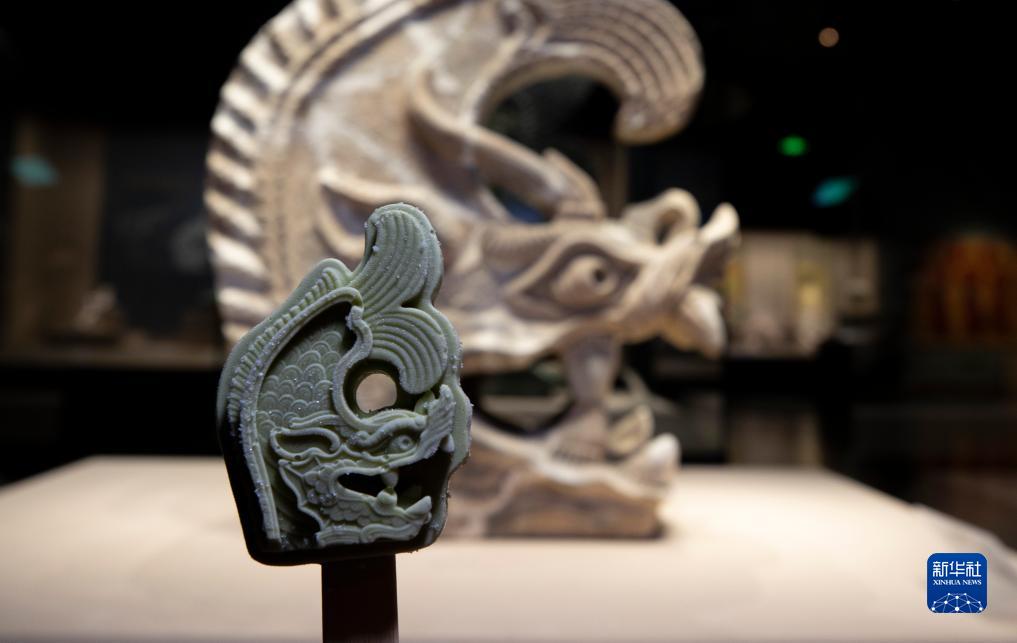 寧夏博物館的文創(chuàng)產(chǎn)品鴟吻文創(chuàng)雪糕(前)與館藏灰陶鴟吻(2022年5月16日攝)。寧夏博物館立足自身館藏文物,以寧夏地域特色文化為基礎(chǔ),成立文創(chuàng)產(chǎn)品設(shè)計研發(fā)團隊,將年輕時尚元素注入文創(chuàng)產(chǎn)品中。