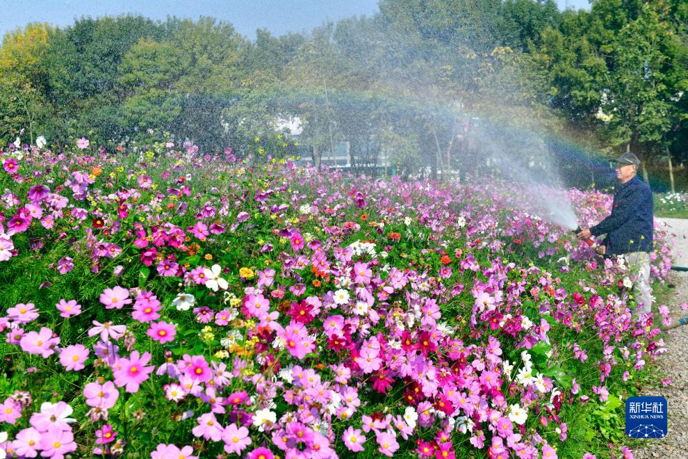 10月25日,工作人員在養(yǎng)護(hù)日照市東港區(qū)碳匯花海。