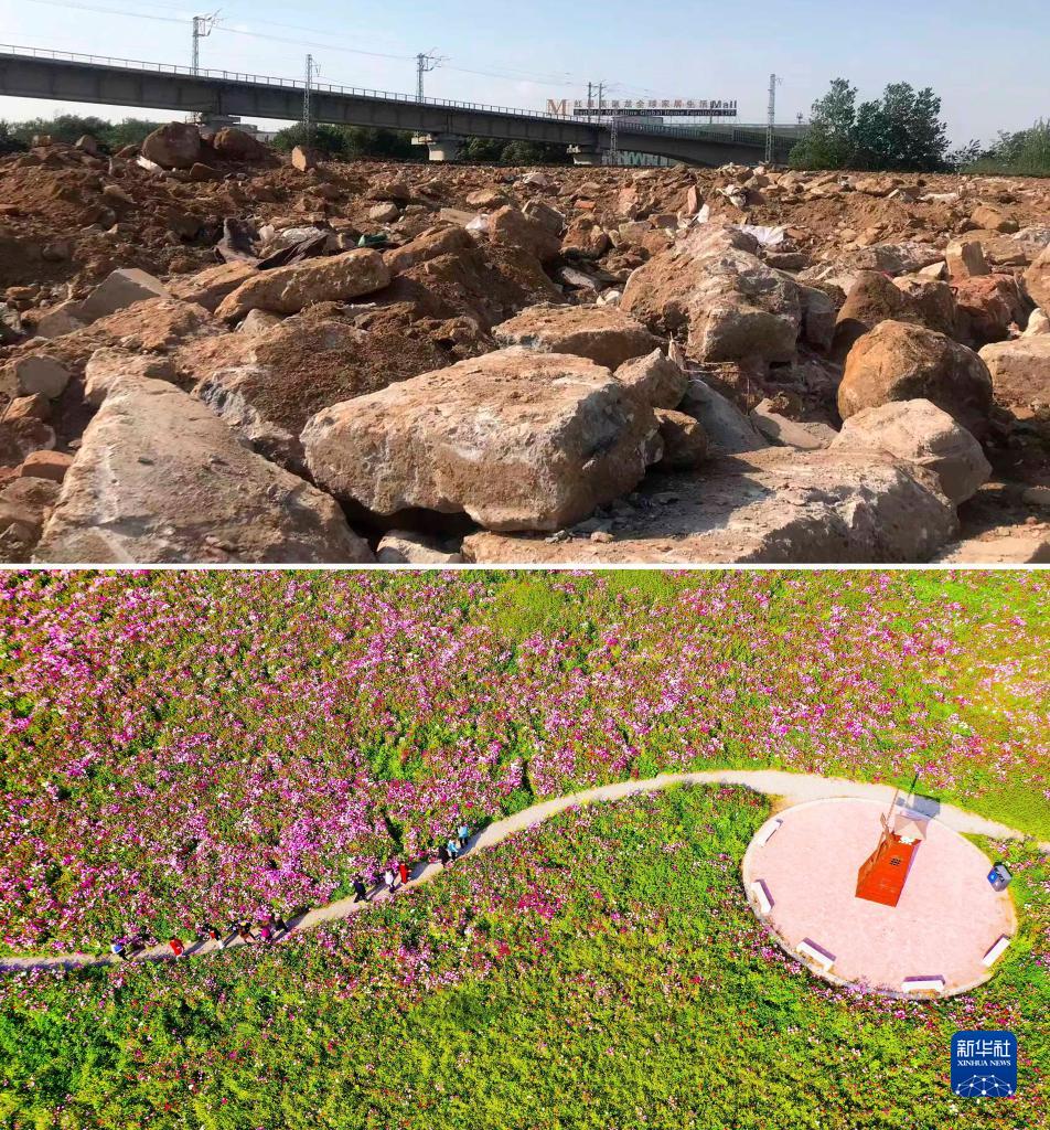 拼版照片:上圖為日照市東港區碳匯花海未整治前的畫面(資料照片);下圖為2023年10月25日拍攝的日照市東港區碳匯花海(無人機照片)。