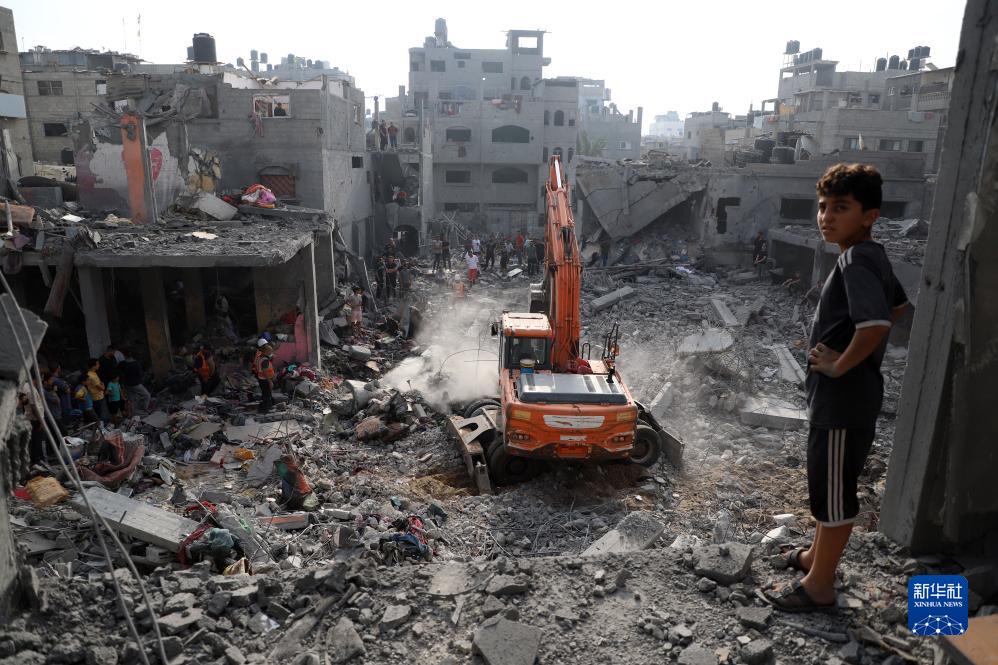 10月25日,在加沙地帶南部城市汗尤尼斯,挖掘機(jī)在以色列空襲后的建筑廢墟現(xiàn)場(chǎng)作業(yè)。