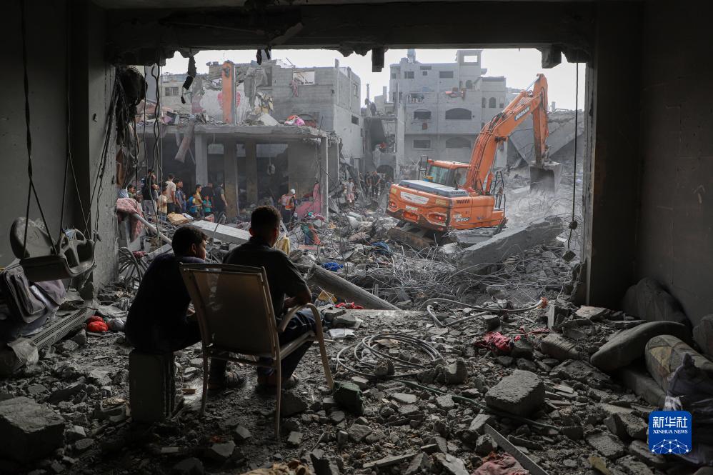 10月25日,在加沙地帶南部城市汗尤尼斯,當(dāng)?shù)鼐用駠^挖掘機(jī)在以色列空襲后的建筑廢墟現(xiàn)場作業(yè)。