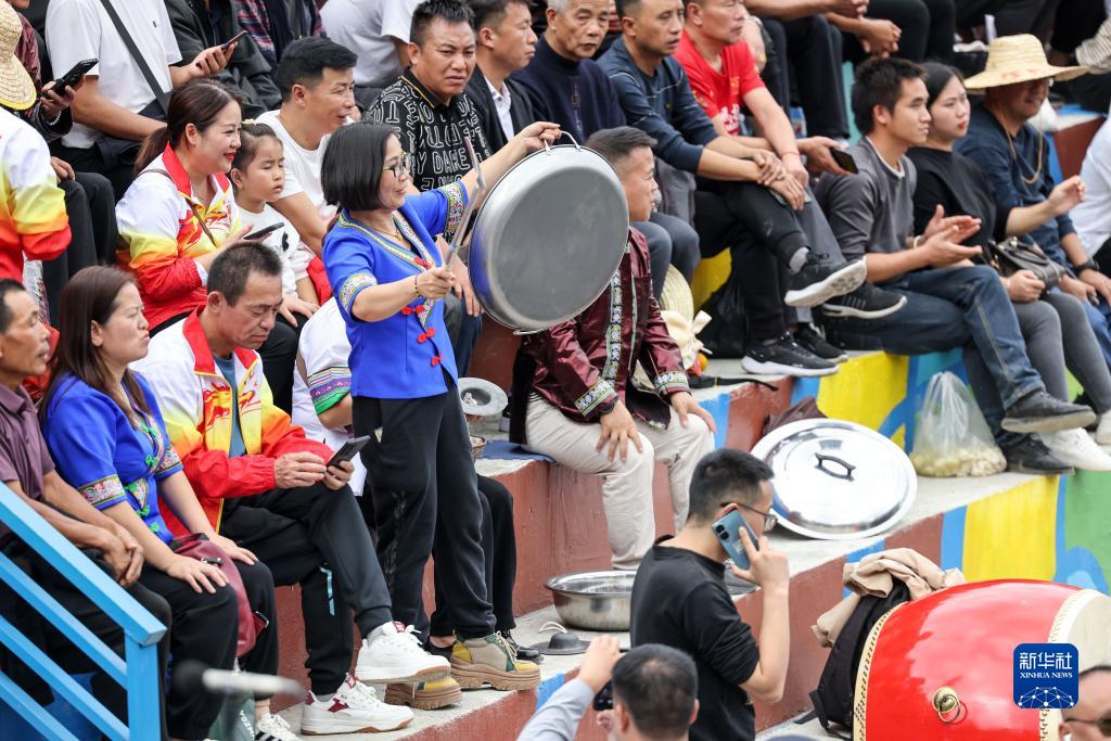 10月25日,觀眾在看臺上敲鐵鍋助威。