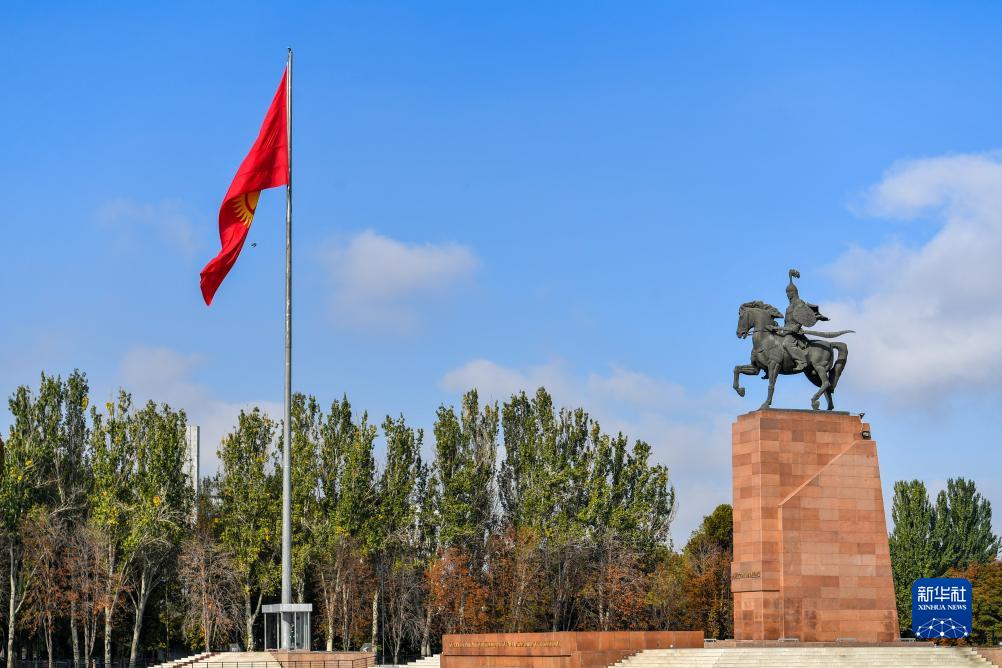 這是10月24日在吉爾吉斯斯坦首都比什凱克的阿拉套廣場拍攝的吉爾吉斯斯坦國旗和瑪納斯雕像。