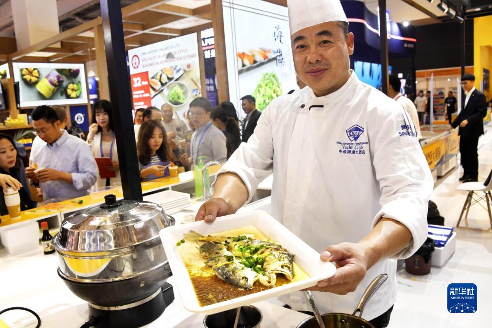 10月25日,參展企業的廚師在漁業博覽會上加工水產品。