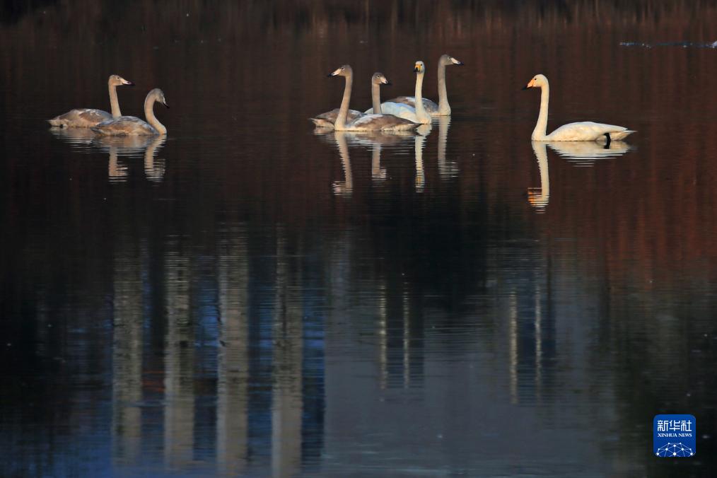 當日,在山東省榮成市天鵝湖,天鵝沐浴晨光,與湖光山色構成詩情畫意的美景。
