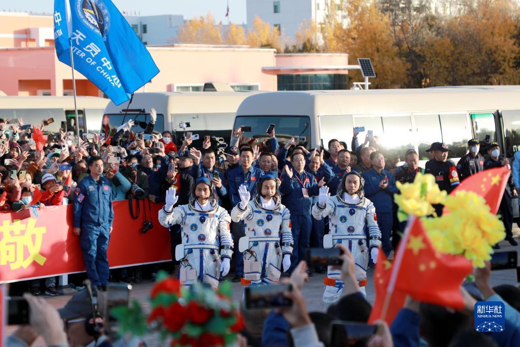 10月26日上午,神舟十七號載人飛行任務航天員乘組出征儀式在酒泉衛星發射中心問天閣圓夢園廣場舉行。這是航天員湯洪波(右)、唐勝杰(中)、江新林在出征儀式上。