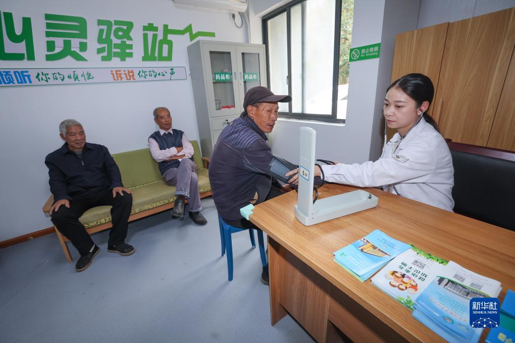 10月26日,在杭州市富陽區湖源鄉居家養老服務中心,社區衛生服務中心醫生為老年人測量血壓。