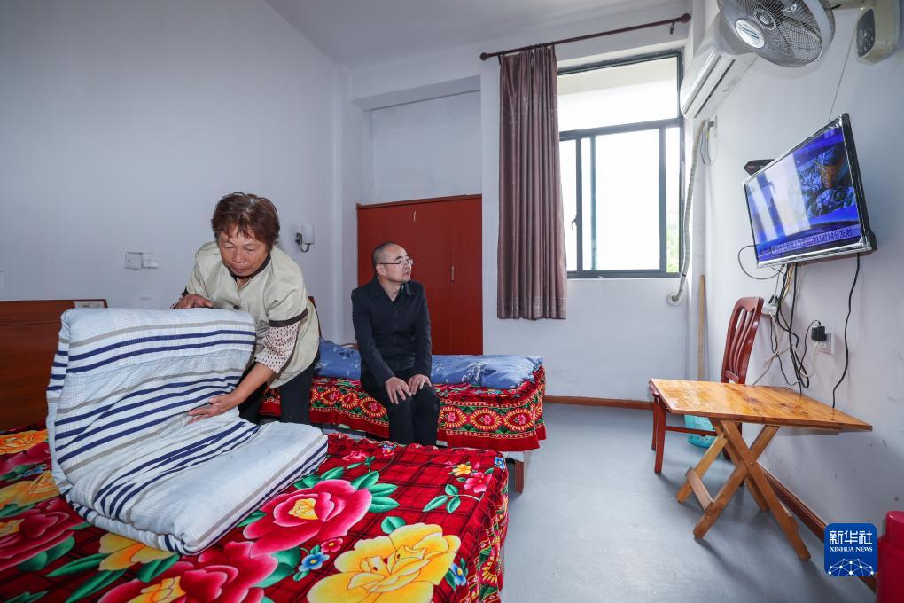 10月26日,工作人員在杭州市富陽區(qū)湖源鄉(xiāng)居家養(yǎng)老服務(wù)中心為老年人整理床鋪。