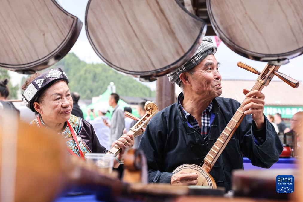 10月25日,布依族藝人在臺江縣球場旁搭建的非遺集市上演奏月琴。