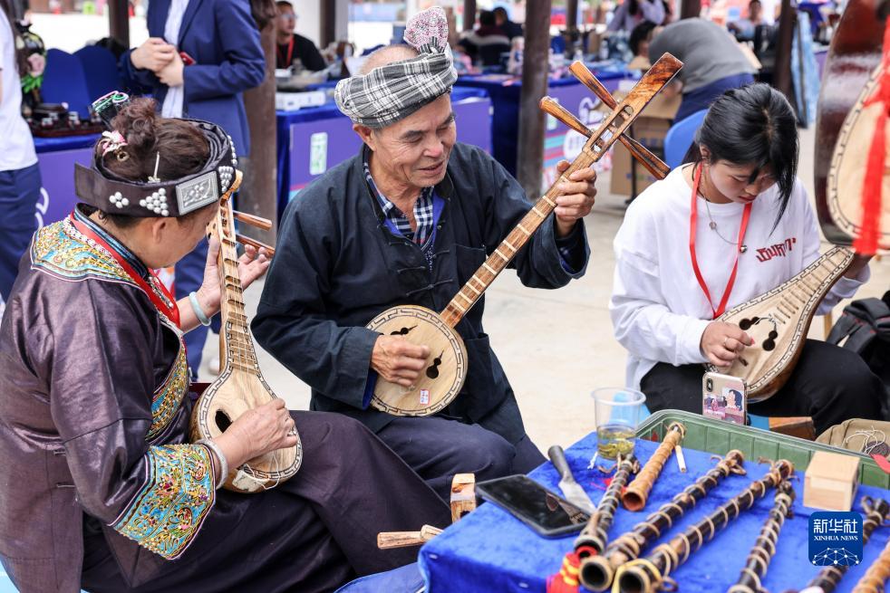 10月25日,布依族藝人在臺江縣球場旁搭建的非遺集市上演奏月琴。