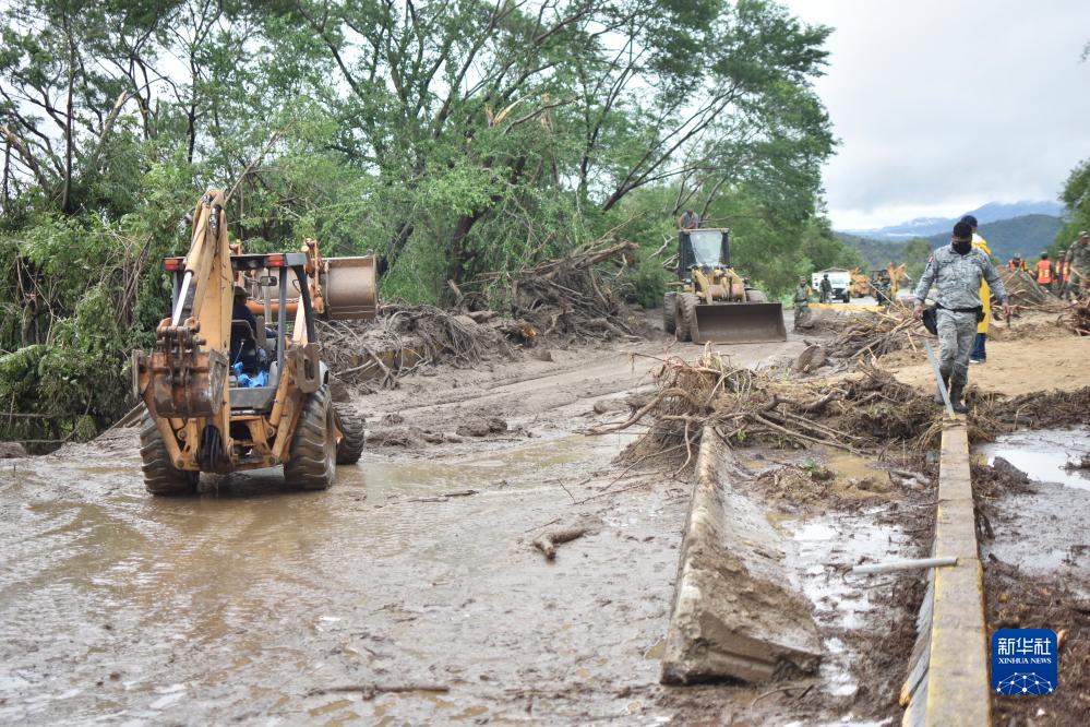 10月25日,在墨西哥格雷羅州奇爾潘辛戈市,工作人員清理因颶風“奧蒂斯”過境而堵塞的道路。