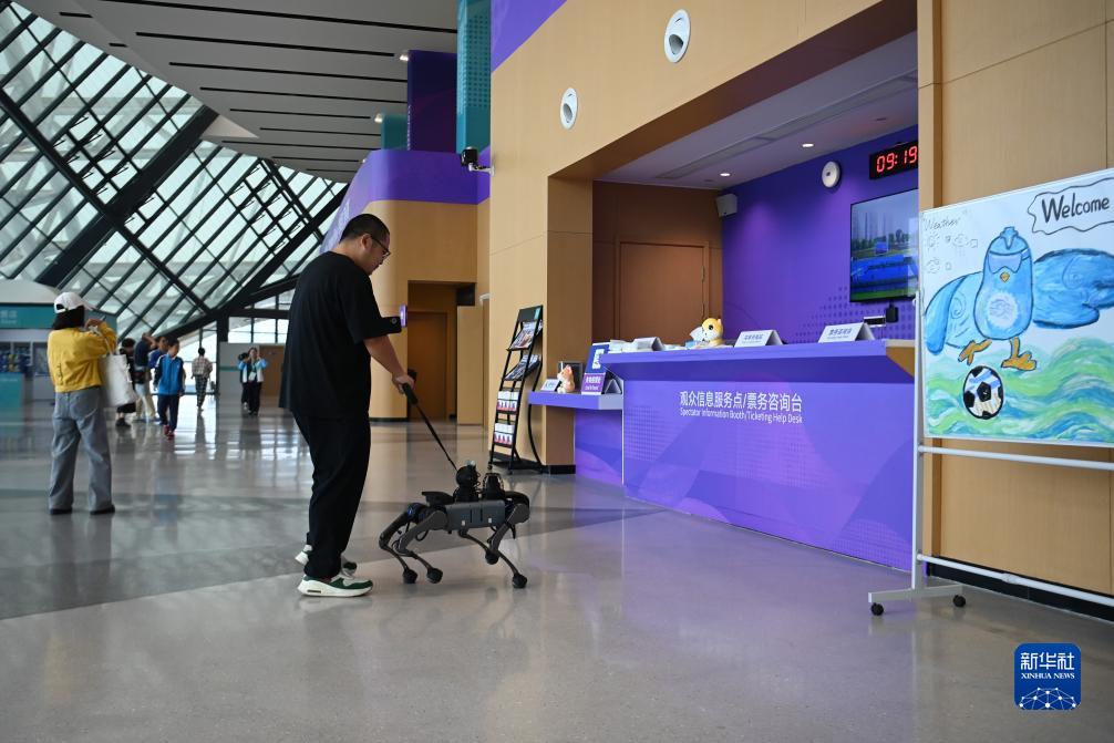 杭州亞殘運會期間,在盲人足球比賽場地拱墅運河體育公園體育場,電子導盲犬“小西”為參加亞殘會的殘障人士提供服務。“小西”由西湖大學機器智能實驗室研發,不僅把場館地圖銘記在“心”,還能“聽懂”中英雙語指令,自動規劃出最優行進路徑,使用者還可以通過牽引它的導盲繩繩端傳感器來調節電子導盲犬的行走速度。