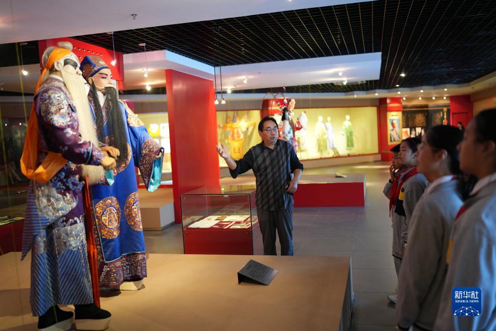 10月25日,在位于湖州市環(huán)渚街道的京劇服飾藝術(shù)館,湖州職業(yè)技術(shù)學(xué)院的老師給前來參觀的小學(xué)生講解館藏的京劇戲服。