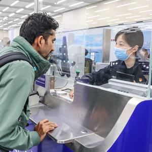 10月25日,在青島膠東國際機場,一位外籍旅客在山東出入境邊防檢查總站青島機場邊檢站辦理入境通關(guān)手續(xù)。