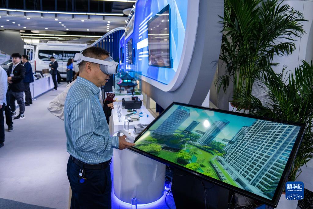 10月26日,在株洲國際會展中心,觀眾穿戴VR設備體驗利用北斗技術輔助建模的地圖仿真模型。