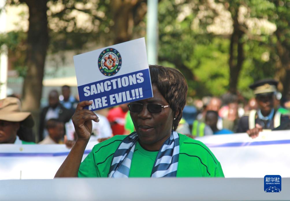 10月25日,在津巴布韋首都哈拉雷,一名女子手持標語參加抗議西方非法制裁的游行。
