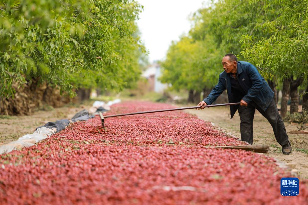10月7日,山東省樂陵市朱集鎮后朱村棗樹合作社社員在晾曬小棗。