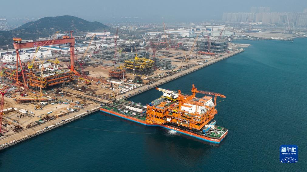 10月26日在青島建造現場拍攝的埕北油田中心平臺(無人機照片)。平臺裝船后將赴渤海西部海域,進入海上安裝和調試階段。