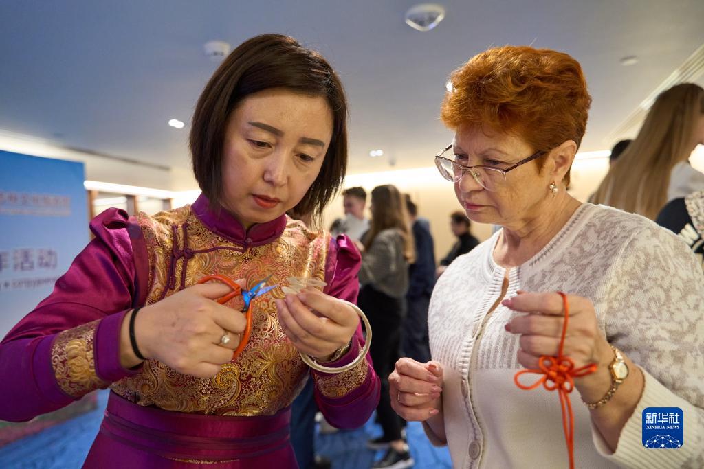10月26日,在俄羅斯符拉迪沃斯托克,來自吉林省的手工藝人徐卉(左)向觀眾展示魚皮畫制作。
