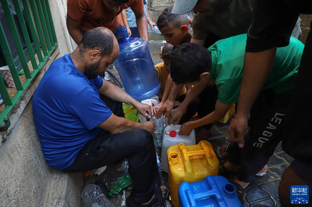 10月26日,人們在加沙地帶南部城市汗尤尼斯街頭打水。