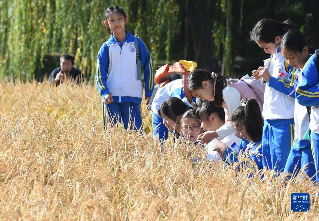 10月27日,來自中國農(nóng)業(yè)科學院附屬小學的學生在圓明園“多稼如云”景區(qū)的稻田邊觀察稻谷。
