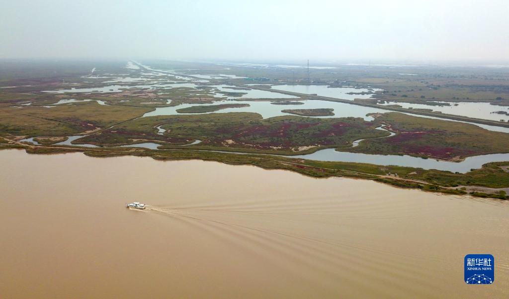 2023年10月12日在山東省東營市拍攝的黃河與黃河三角洲濕地(無人機照片)。
