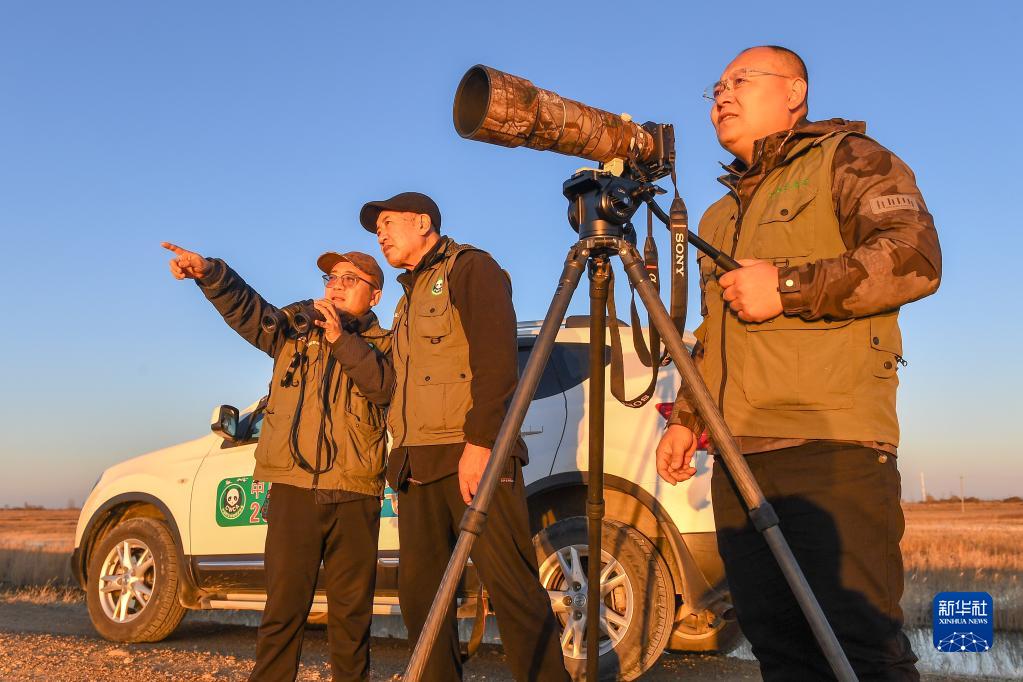 10月26日,中國野生動物保護協(xié)會吉林白城護飛隊隊員王巖(左)、張惠超(中)和姜海濤觀察、拍攝候鳥。