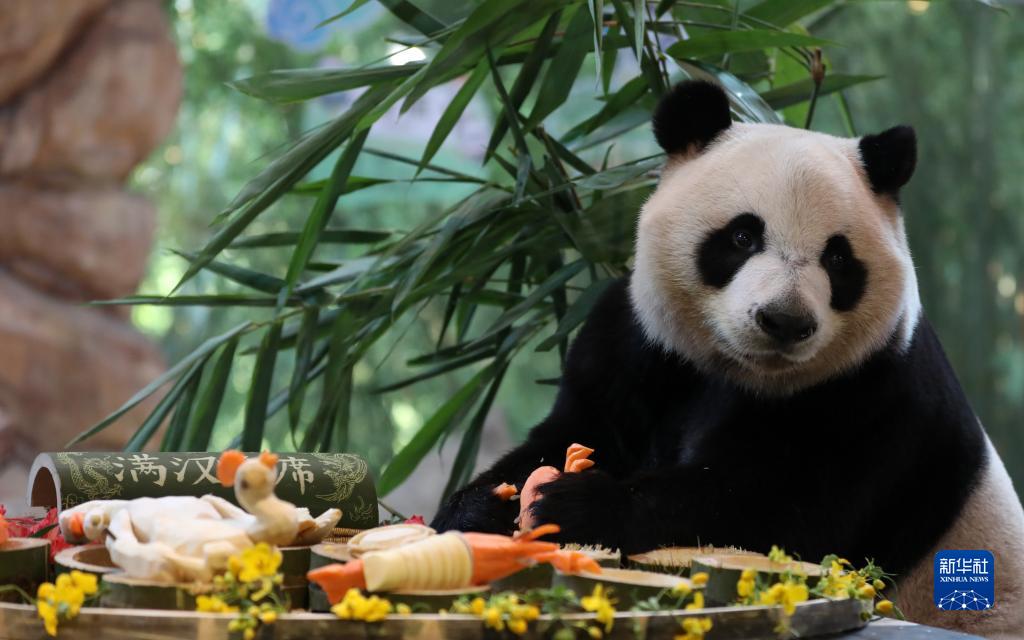 10月27日是國際熊貓日。廣州長隆野生動物世界保育員為大熊貓“酷酷”準備了豐盛的“滿漢全席”,包括“鳳尾魚翅”“干連福海參”“羅漢大蝦”等八大菜式。