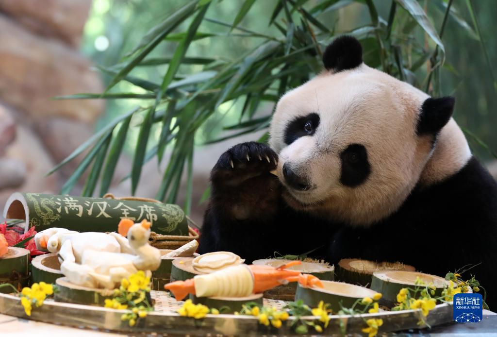 10月27日是國際熊貓日。廣州長隆野生動物世界保育員為大熊貓“酷酷”準備了豐盛的“滿漢全席”,包括“鳳尾魚翅”“干連福海參”“羅漢大蝦”等八大菜式。