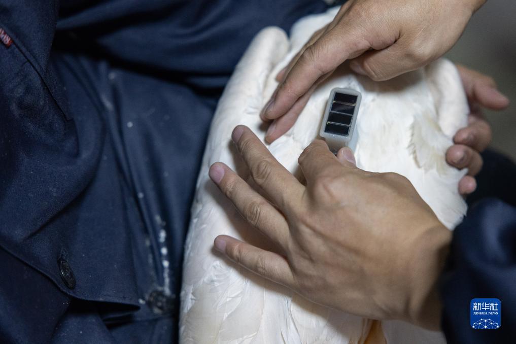 10月26日,在江蘇鹽城濕地珍禽國家級自然保護區朱鹮野化訓練地,工作人員給朱鹮安裝監測背包。