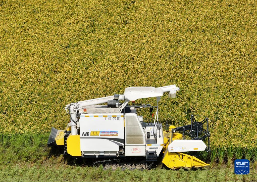 10月27日,無人駕駛機械在江蘇省南通市通州區(qū)十總鎮(zhèn)育民村高標準農(nóng)田收割水稻(無人機照片)。