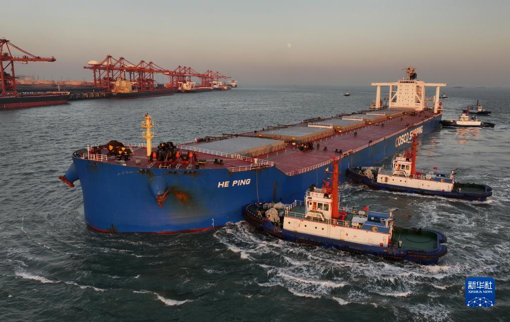 10月27日,一艘輪船在拖輪的協助下向唐山港曹妃甸港區礦石碼頭靠泊(無人機照片)。