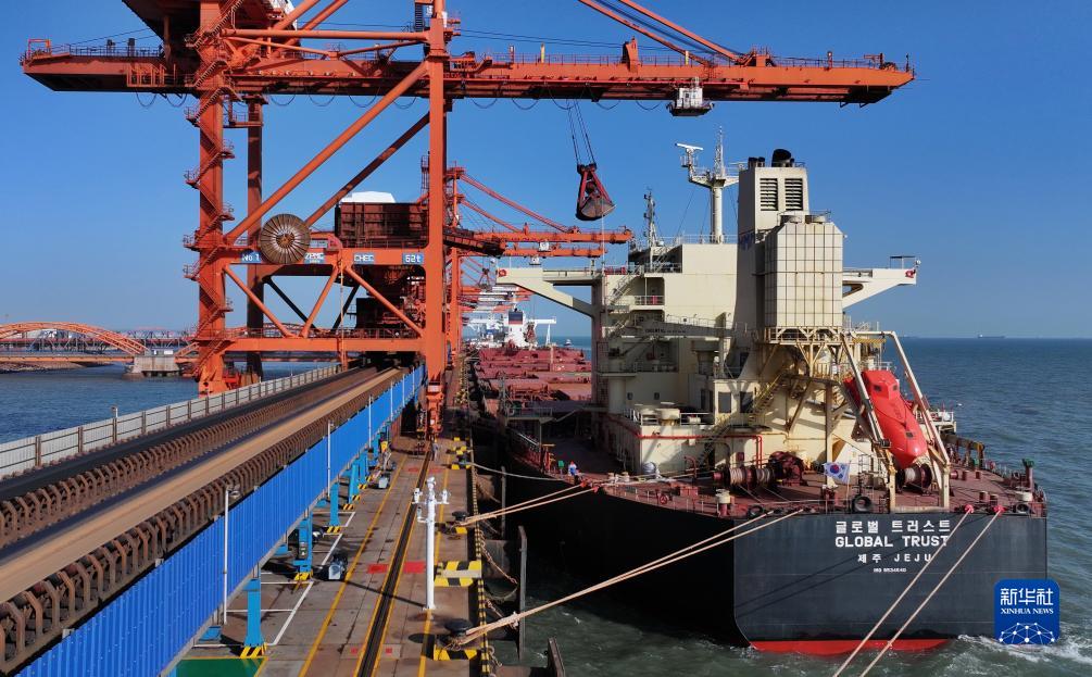 10月27日,一艘輪船靠泊在唐山港曹妃甸港區礦石碼頭卸載(無人機照片)。