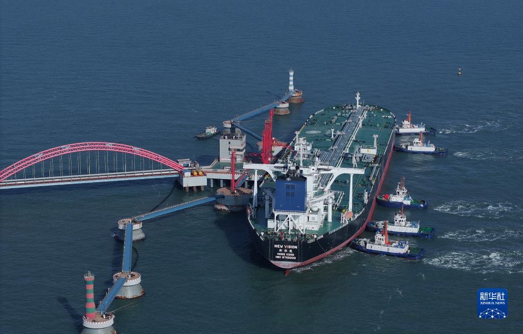 10月27日,一艘LNG船在拖輪的協(xié)助下向唐山港曹妃甸港區(qū)LNG碼頭靠泊(無人機(jī)照片)。