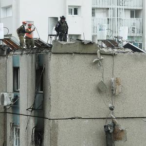 這是10月27日在以色列特拉維夫拍攝的遭到火箭彈襲擊的受損建筑。