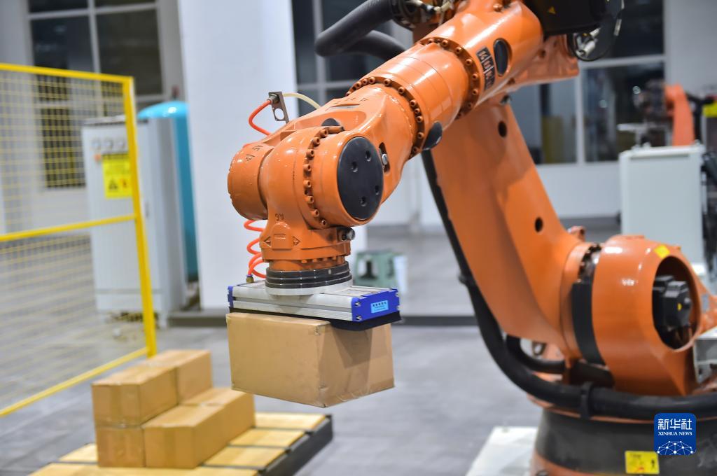 10月26日在山東省聊城市臨清市新森機械有限公司拍攝的碼垛機器人。