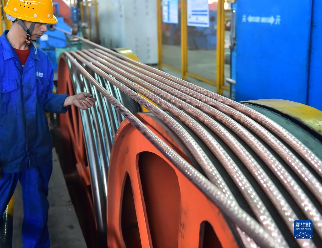 10月27日,技術工人在山東省聊城市陽谷縣漢河(陽谷)電纜有限公司生產車間電纜生產線上值守。