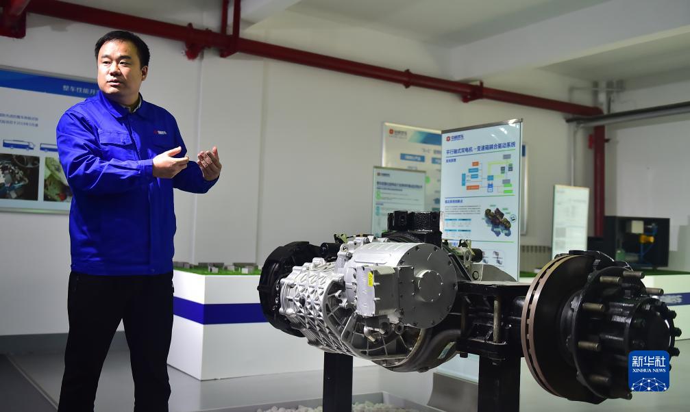 10月26日,山東省聊城市中通客車股份有限公司工作人員介紹中通客車研發(fā)的一款變速箱耦合驅(qū)動系統(tǒng)。