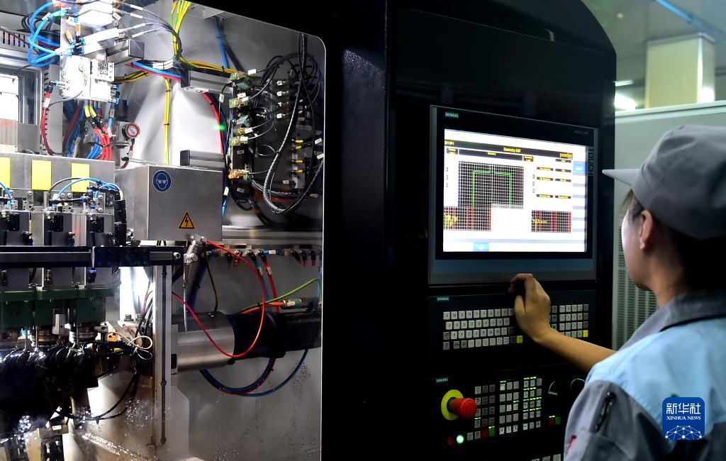 10月26日,在山東省聊城市高新區(qū)山東鑫亞格林鮑爾燃油系統(tǒng)有限公司生產(chǎn)車間,技術(shù)人員在生產(chǎn)線上操作設(shè)備。