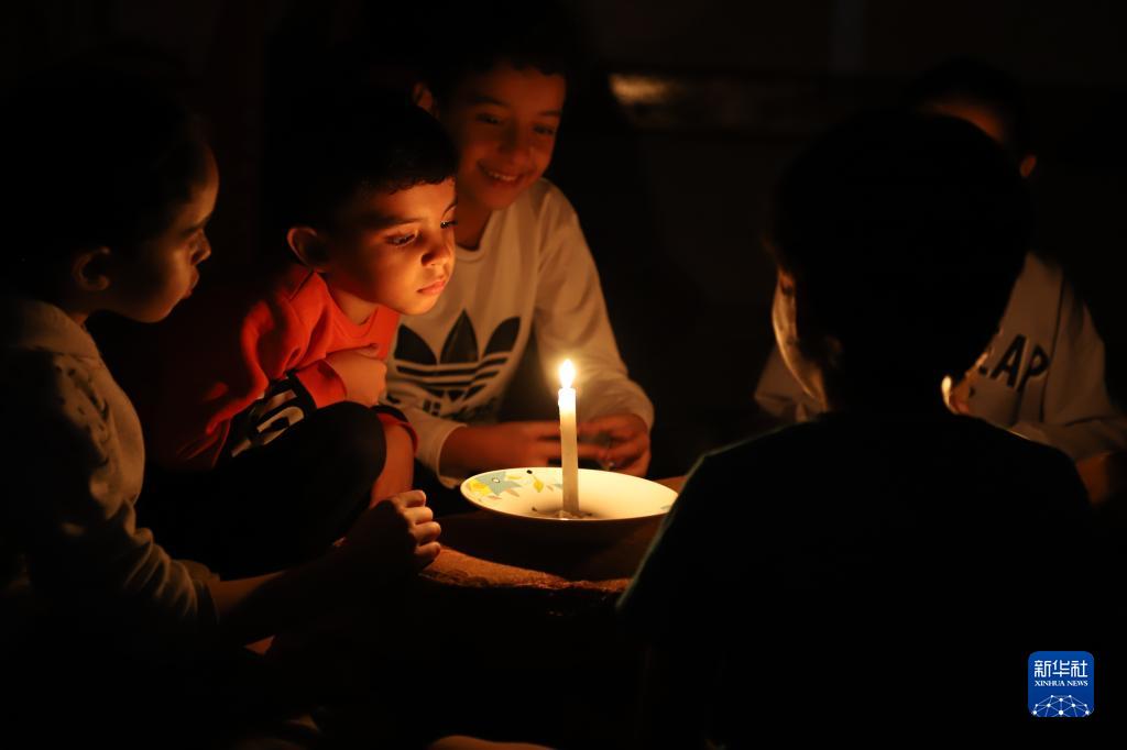 這是10月20日在加沙地帶南部城市汗尤尼斯拍攝的使用蠟燭照明的兒童。