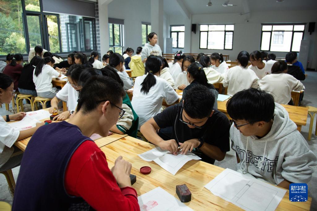 10月24日,在安徽省黃山市歙縣老胡開文墨業有限公司,前來研學的學生在體驗拓印墨模。