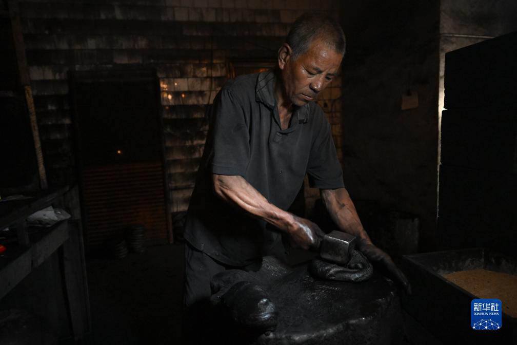 10月25日,在安徽省黃山市歙縣老胡開文墨業(yè)有限公司,工人將骨膠與煙灰混合后的墨泥錘打成墨餅。
